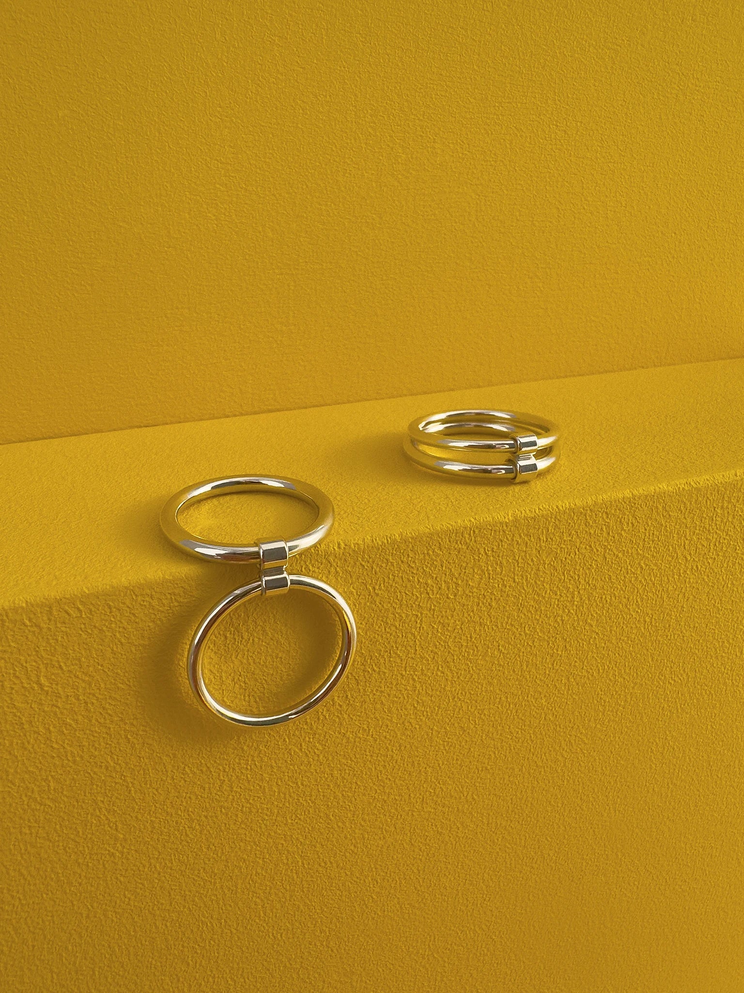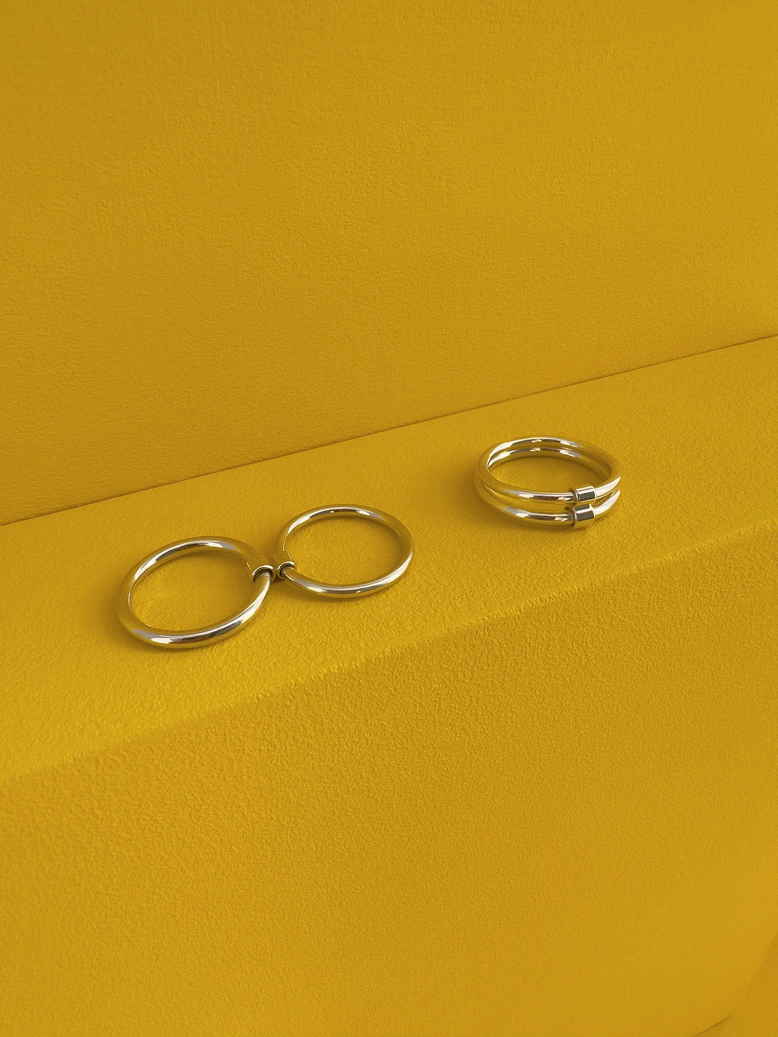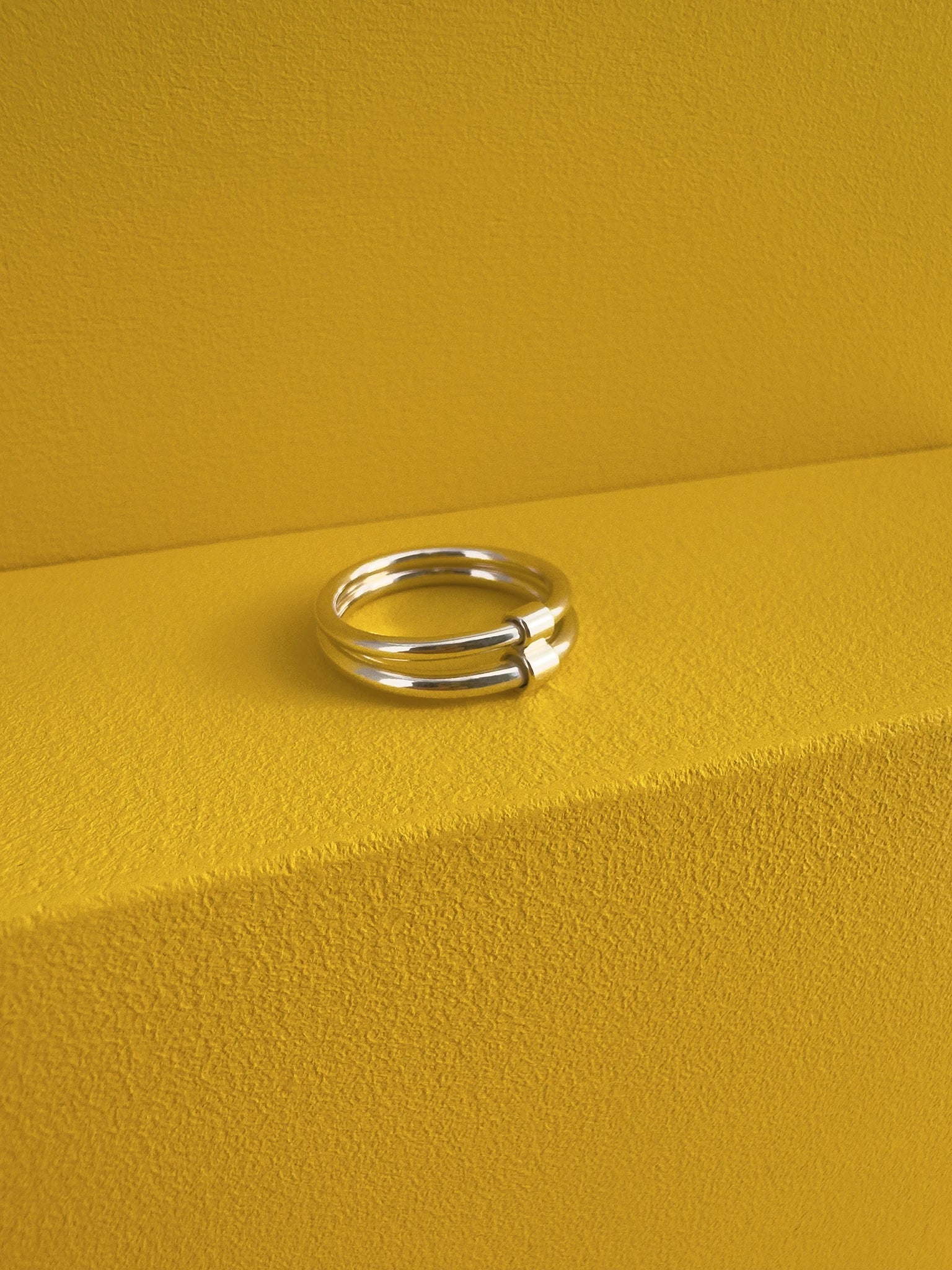 Two round wire rings with differing thicknesses, movably linked by a tube element, reflecting the series' idea of connection and bond.