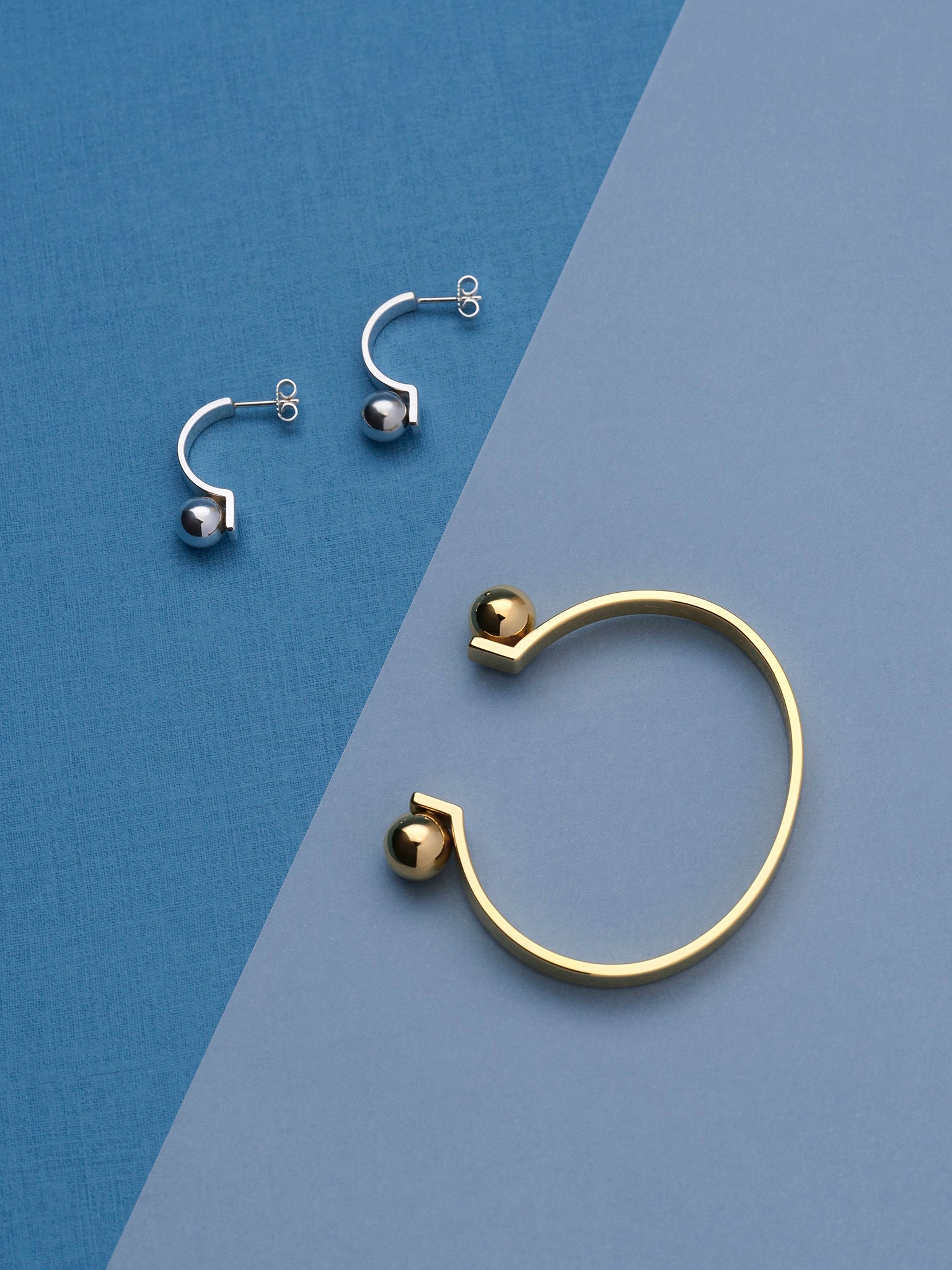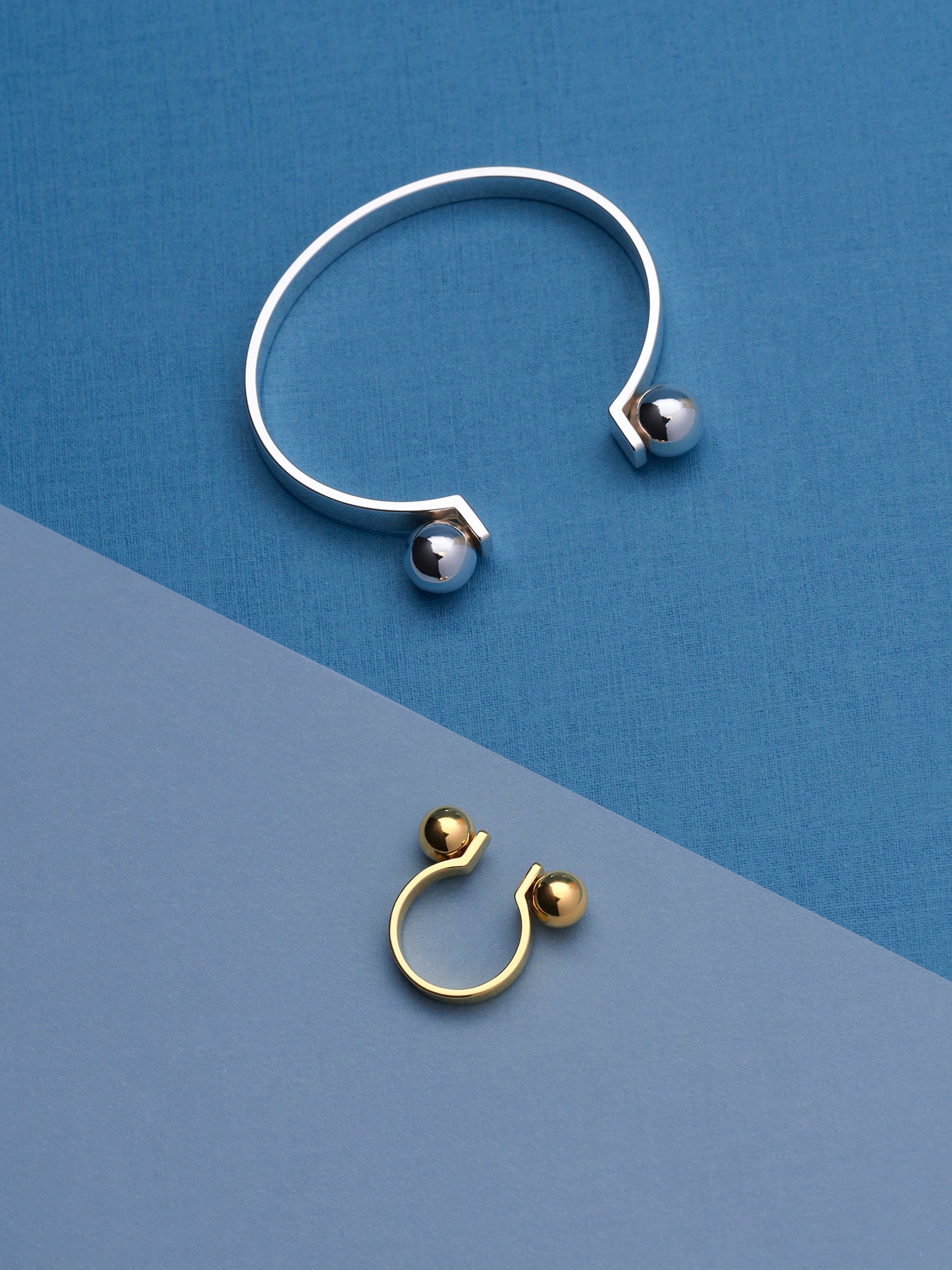The DOUBLE SPHERE series is rooted in Bauhaus principles. It centres on the contrast between strict lines and the closed form of the sphere – translated into small sculptures for the body.