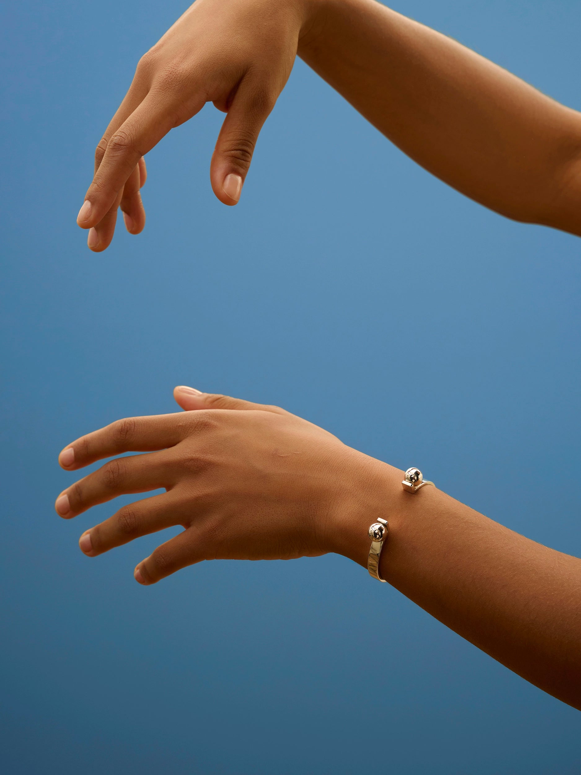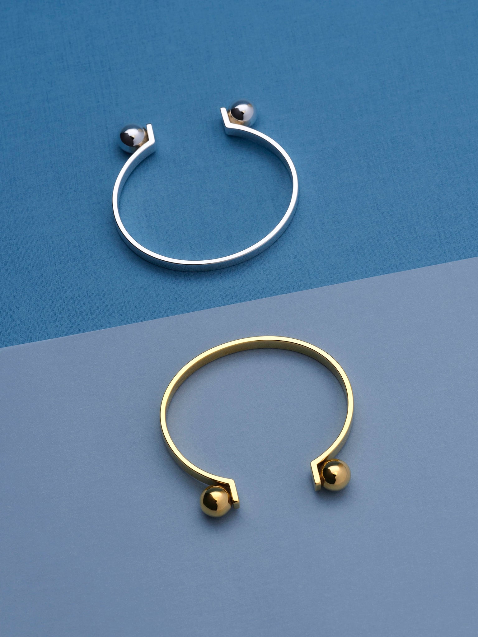 Linear and geometric cuff with two solid spheres marking the open ends.