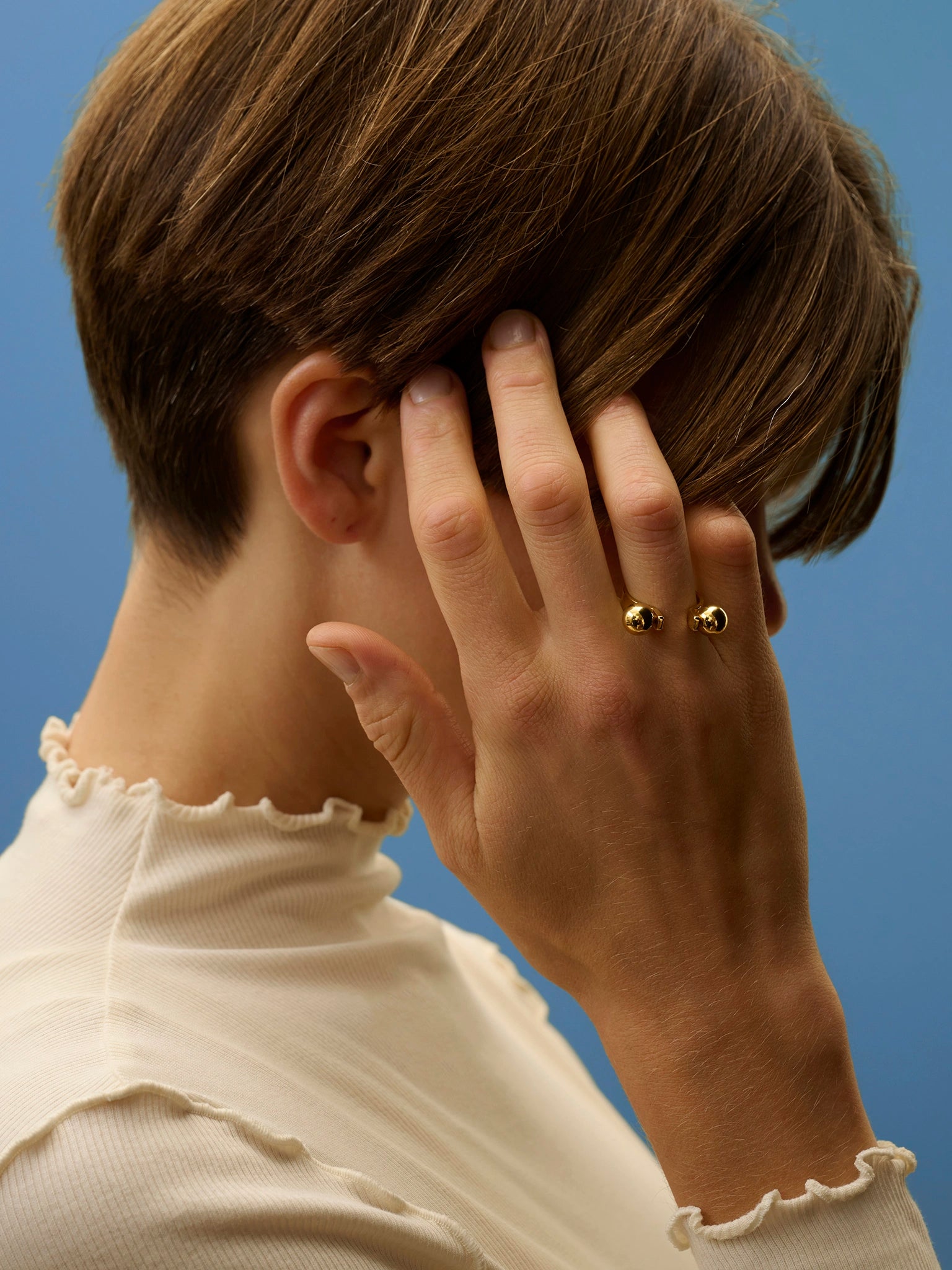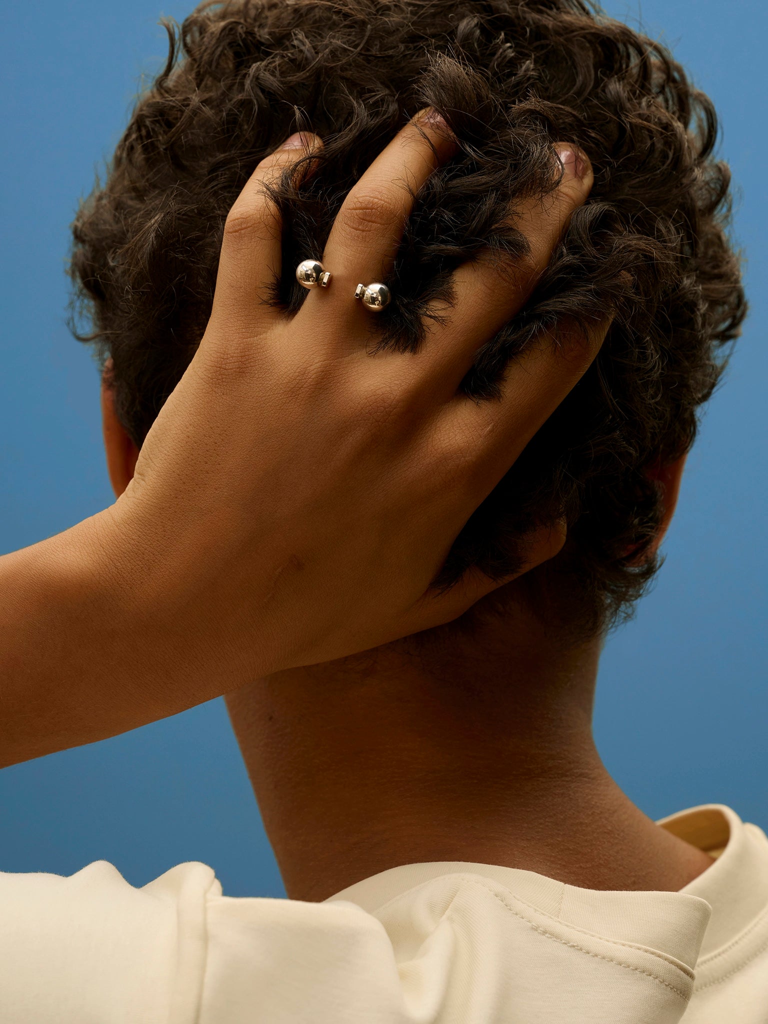 Bold, geometric open ring, holding two solid spheres that rest between your fingers.