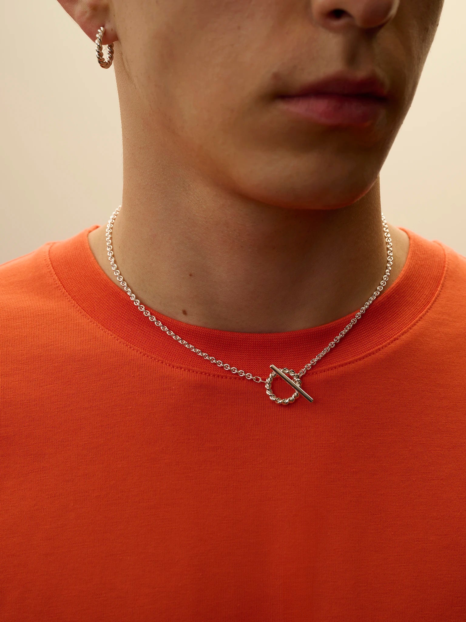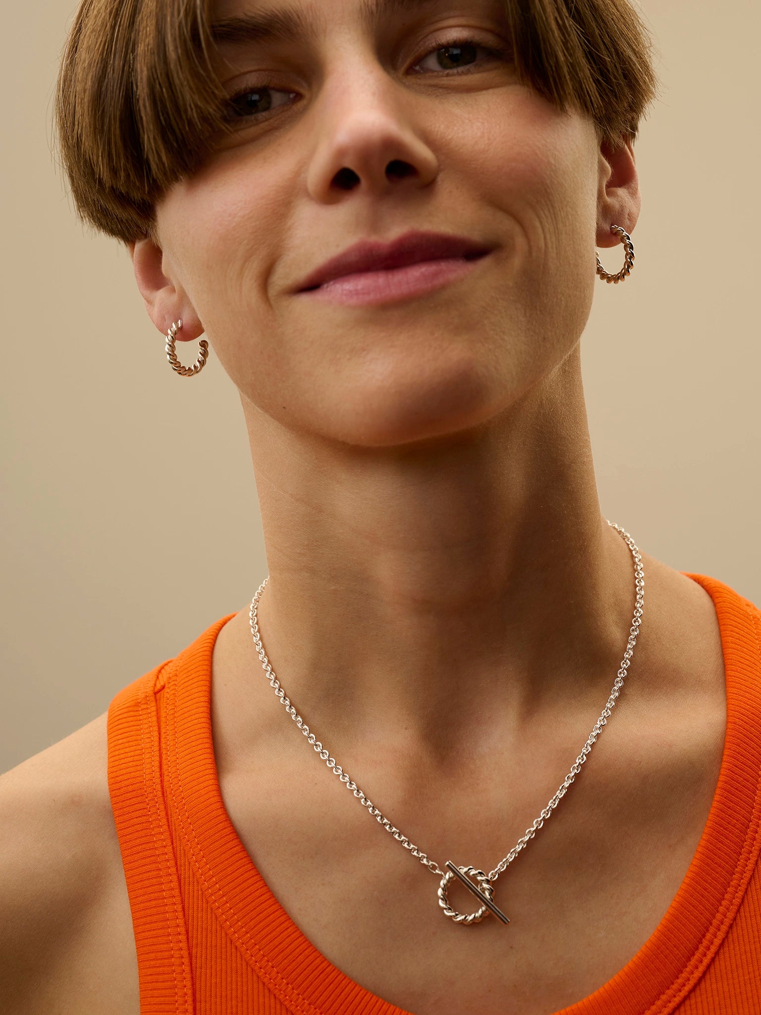 The ROPE series draws on the structure of a classic rope. Two strands of round wire are twisted by hand to form the basis for pieces that translate a utilitarian object – originally soft and flexible – into solid metal.