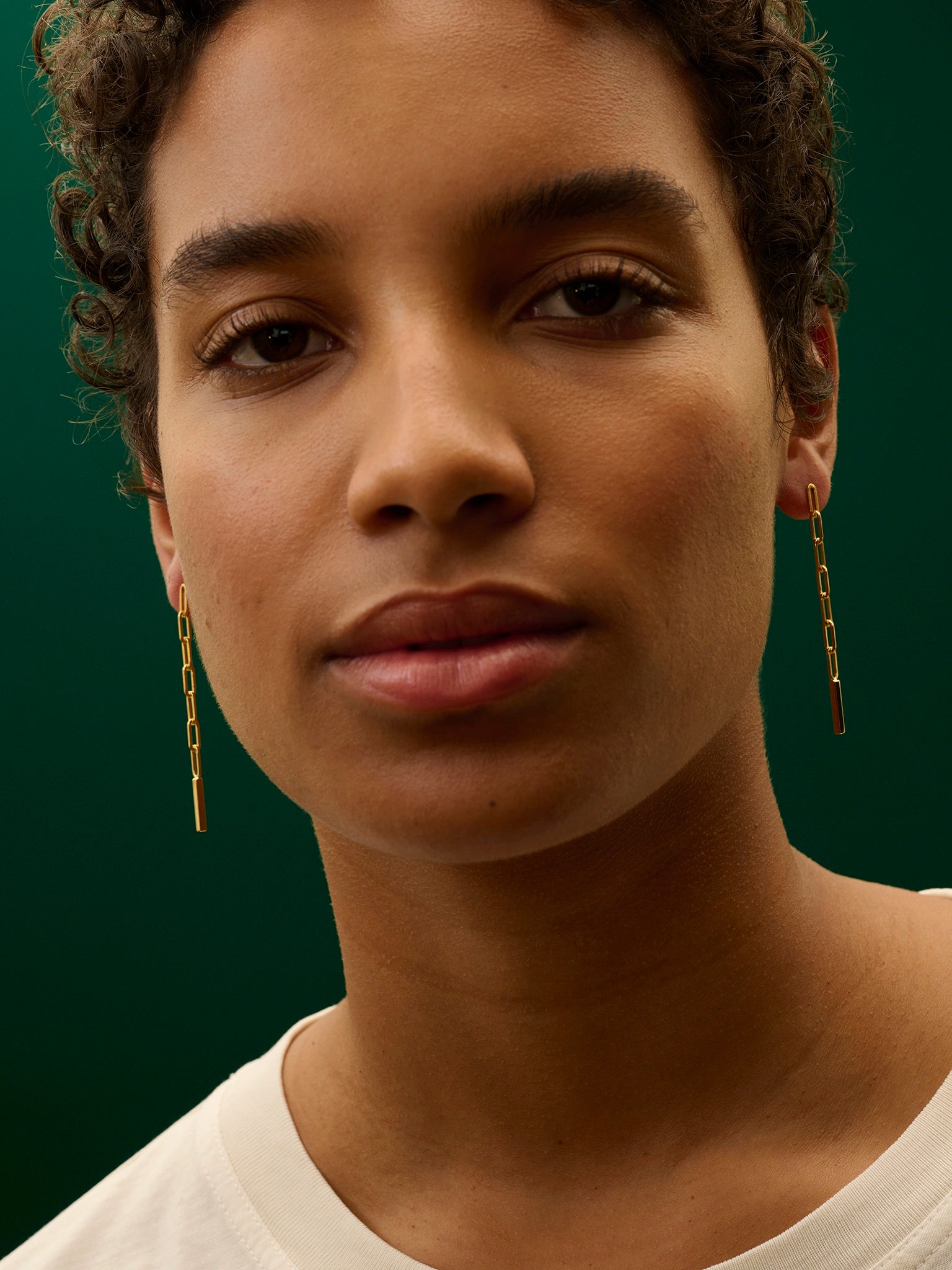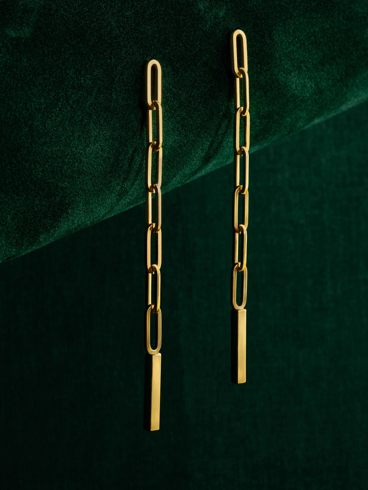 Long earrings combining a finer version of the series’ chain with square wire endings.